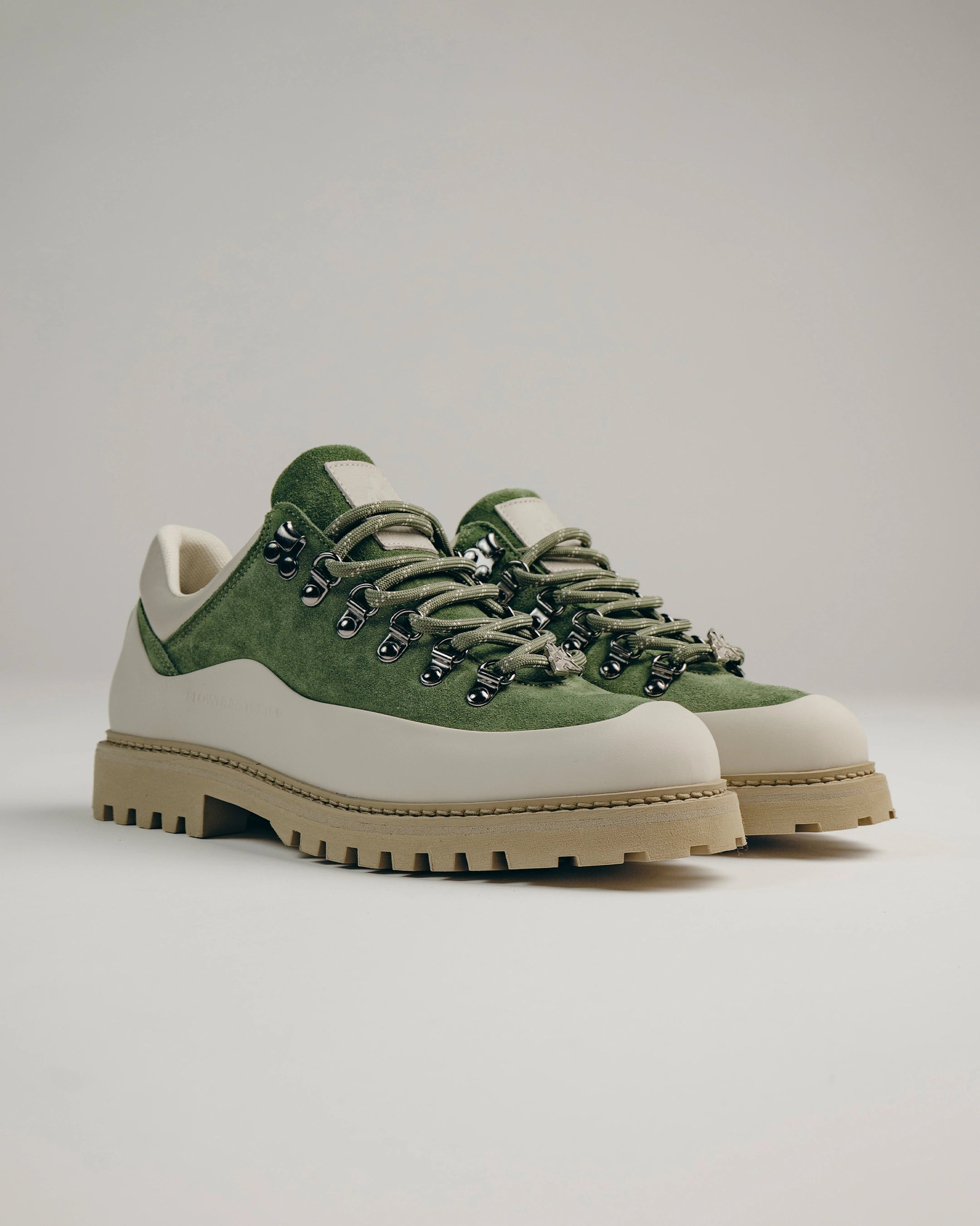 Crafted in Portugal by ethical manufacturers, the pair combines Italian green suede and beige premium leather for a deep, matte texture that evolves beautifully over time.