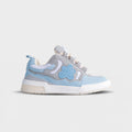 The Paris sneakers reference a '90s inspired design. The upper is elaborate, two-tone of blue and grey and adorned with our signature flower with Italian premium suede material. This model features a chunky look, technical double laces and a two-tone rubber outsole.