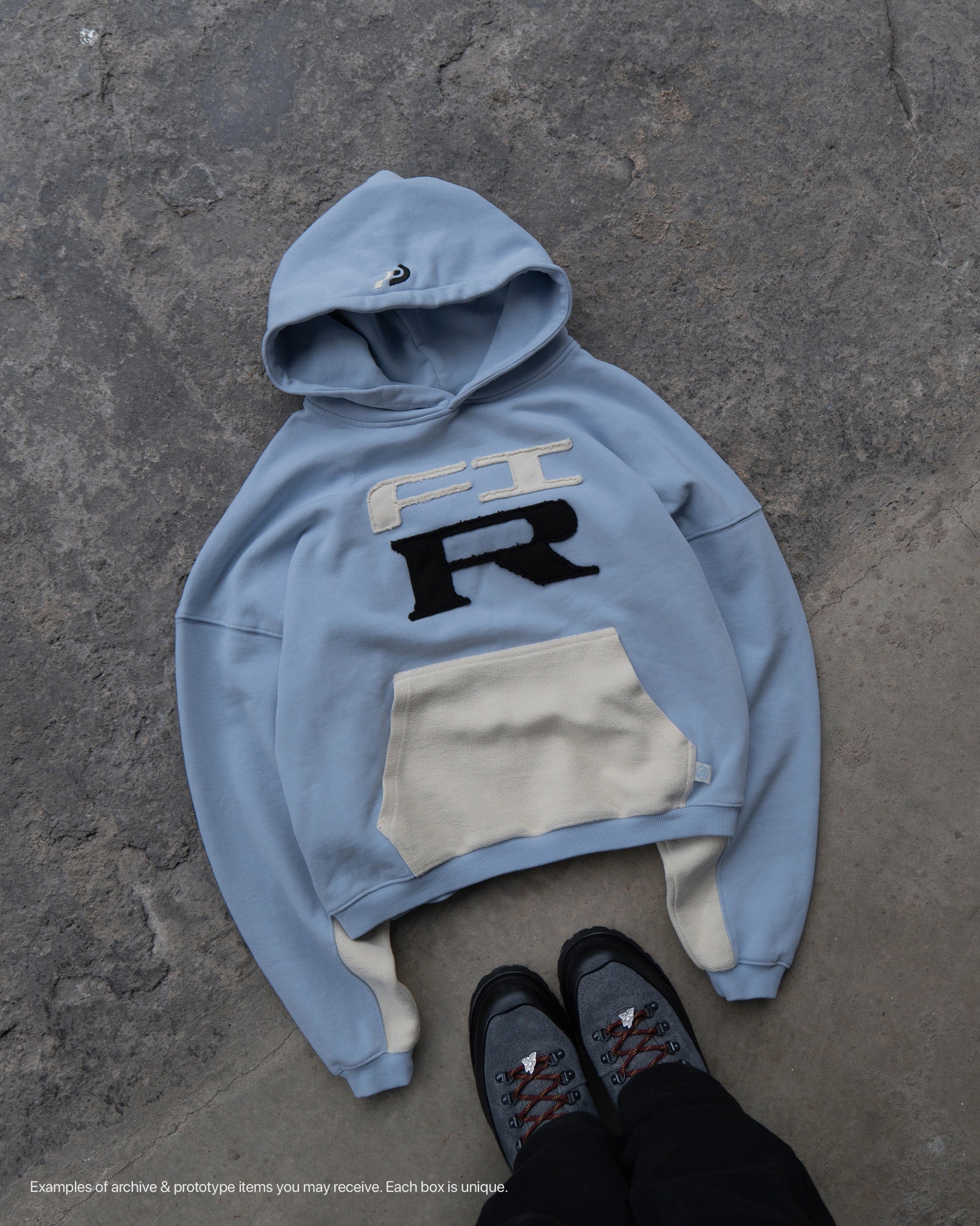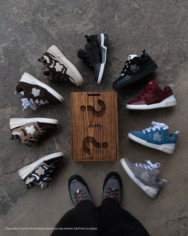 Each Mystery Box contains a curated selection of FI pieces: sneakers, apparel, accessories, archive items and, in some cases, unreleased prototypes or studio exclusives. Every box is unique.