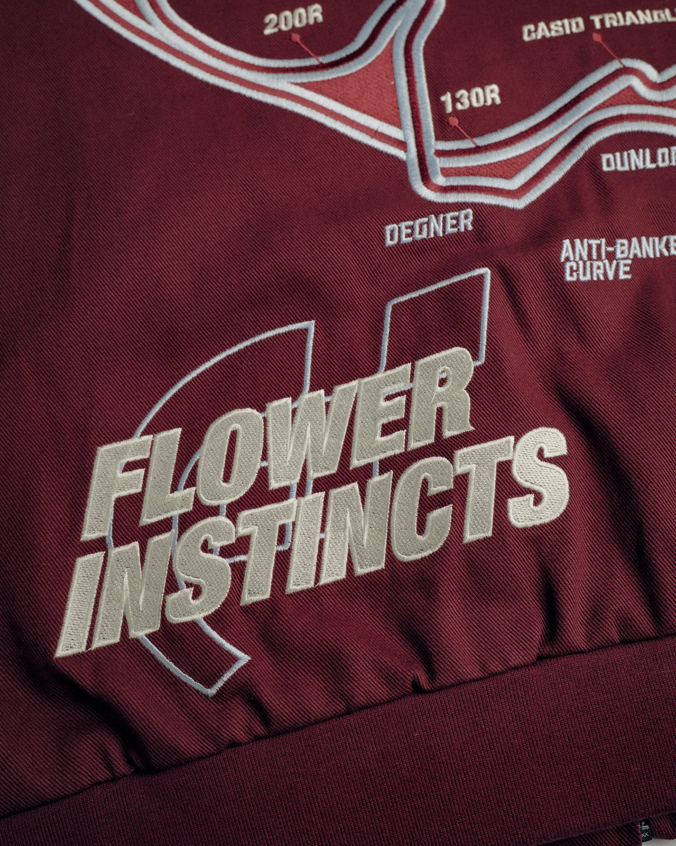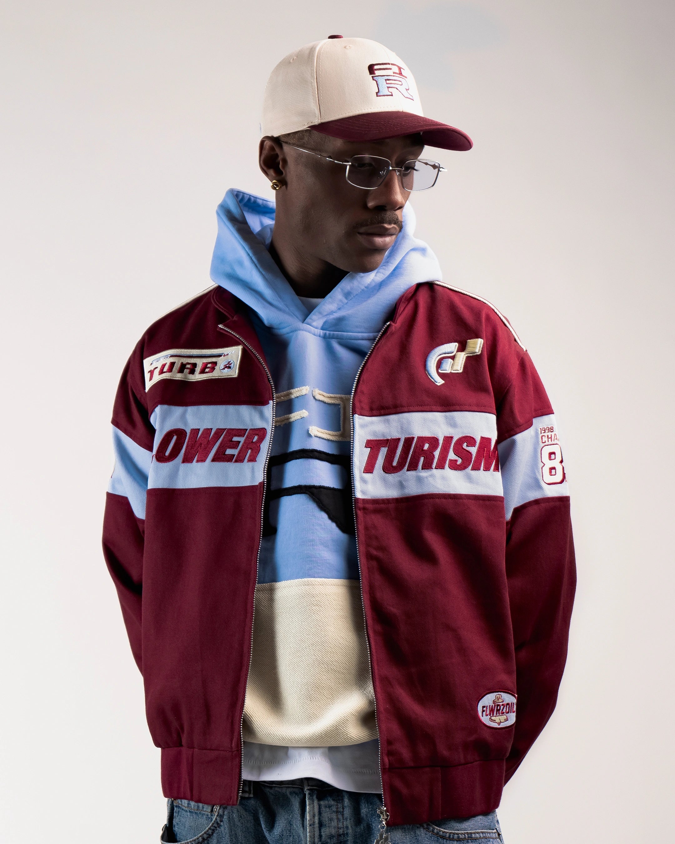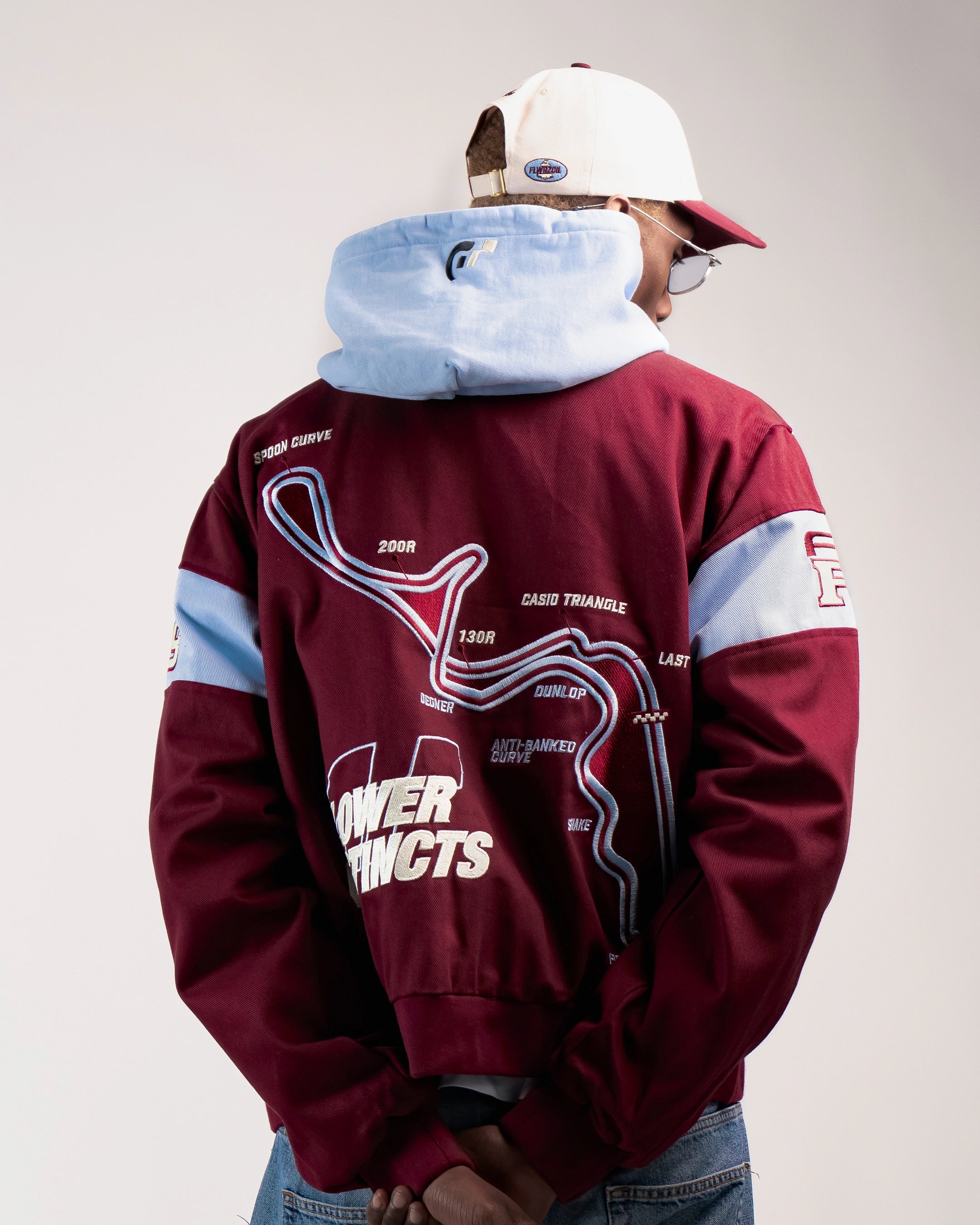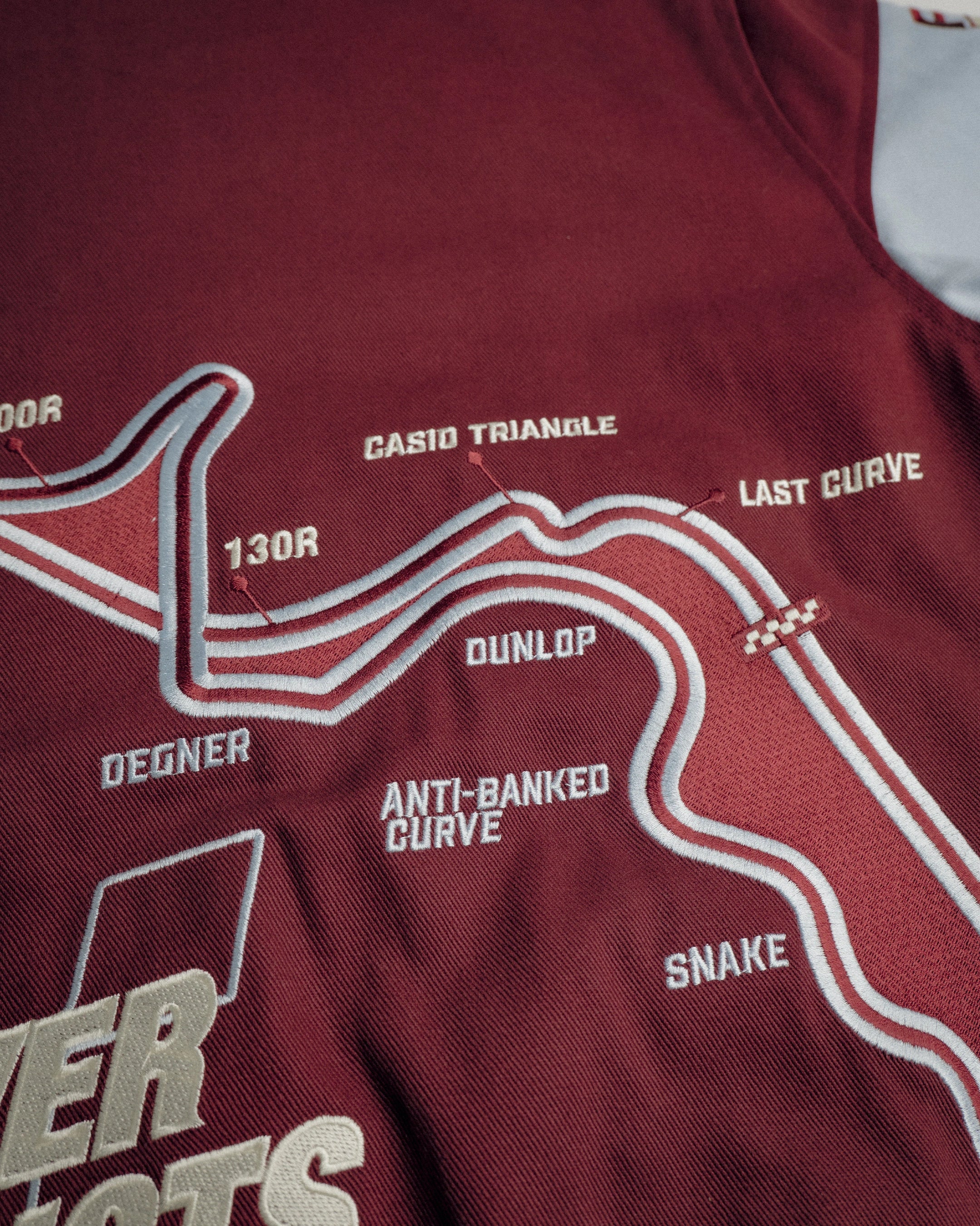 Confectionnée en coton épais, sa teinte bordeaux associée au bleu ciel évoque à la fois la vitesse et l'élégance. Entièrement brodée, chaque emblème raconte un fragment du langage visuel de la marque, mêlant motifs hérités et symboles inspirés du monde du racing.