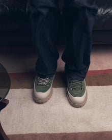 Fabriquée au Portugal par de façon éthiques, cette paire associe du daim vert italien et du cuir beige haut de gamme pour une texture mate et profonde qui évolue magnifiquement avec le temps.