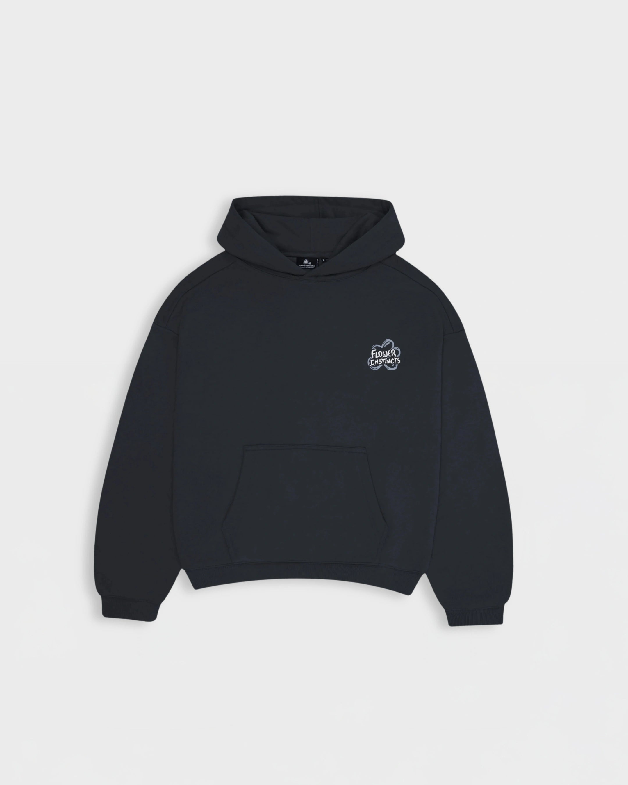 The Cloud Berry hoodie is oversized faded dark blue in 100% organic cotton jersey. High-quality puffprinted on front with original Flower Instincts logo features graphics Cloud Berry on back. This hoodie is a soft premium texture yet lightweight.